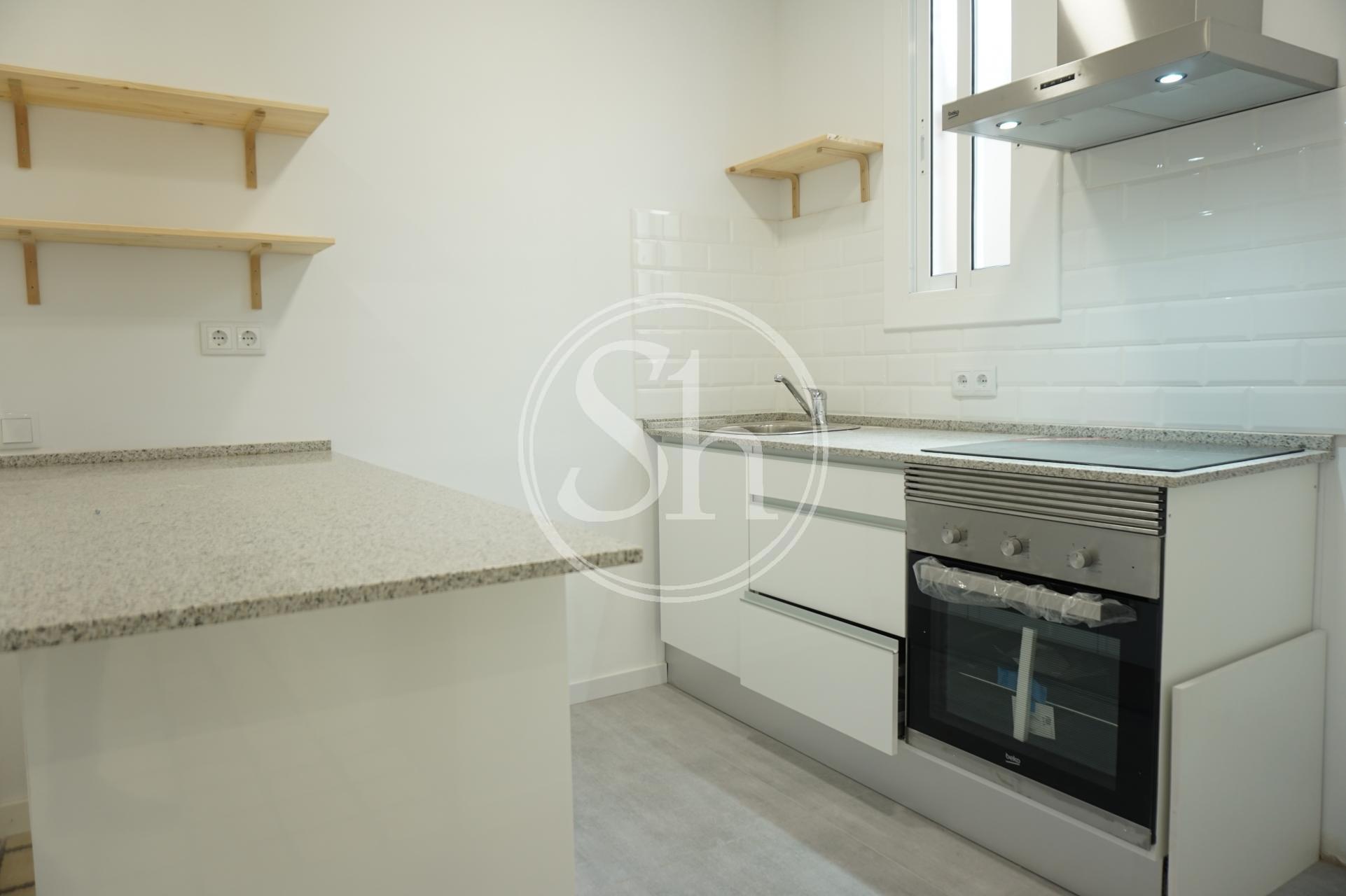 Piso reformado completamente en 2019, en Poble Sec, en el barrio de Sants Montjuïc de Barcelona. Piso sin amueblar de 47m2 habitables con calefacción de radiadores eléctricos. El piso dispone de un salón comedor con cocina americana equipada con horno y encimera de inducción, dos habitaciones dobles exteriores con salida a balcón y un baño con plato de ducha. Lavadora y nevera de cortesía. Tercer piso en finca sin ascensor en zona tranquila y vecindario.